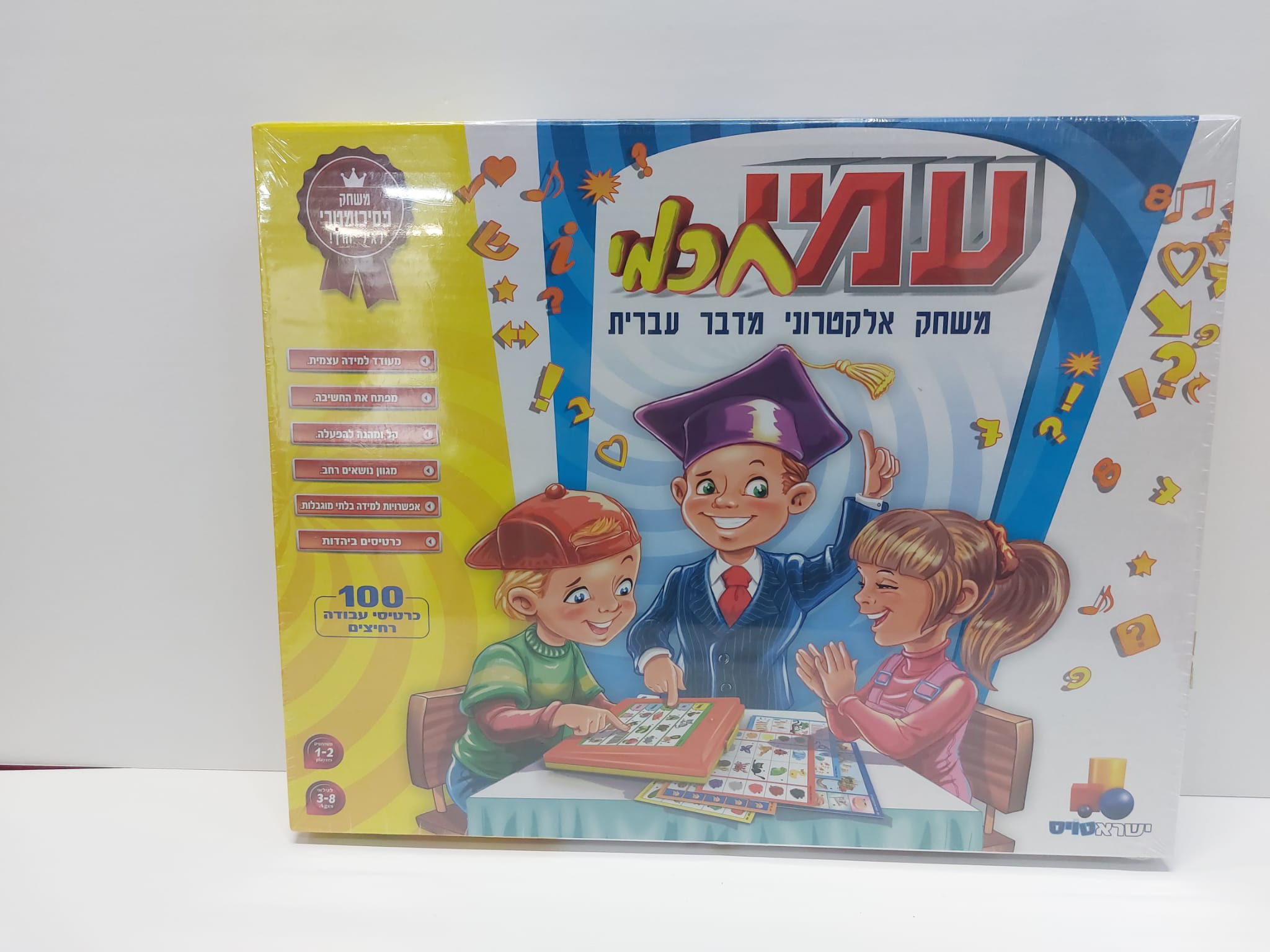 עמי חכמי משחק אלקטרוני דובר עברית -  ישראטויסהמשחק הוותיק והאהוב במחיר חסר תקדים!משחק אלקטרוני מדבר עברית – המורה האלקטרוני לגיל הרך!מומחים מסכימים שהמורה הטוב ביותר הוא אתגר מהנה.תפיסה זו באה לידי ביטוי באמצעות המשחק עמי חכמי,משחק לימודי מרהיב לגיל הרך.עמי חכמי הינו מורה אלקטרוני המפתח את כישורי החשיבה והלמידה להם זקוקים הילדים בהמשך חייהם. יתרונו של המורה האלקטרוני הוא שהינו משמש כחוויה לימודית המשותפת להורים ולילדיהם.המורה האלקטרוני לגיל הרך מעורר תוך כדי משחק את המוטיבציה ללמודומוביל את הילד בדרך הגיונית ומסודרת להישגים חינוכיים.בנוסף, המשחק מחזק את ההישגיות הפוטנציאלית ומפתח כישורי חשיבה הגיונית.המשחק מפתח אצל הילד את יכולות הלימוד והחשיבה העצמית הנחוצים ללימודיו כבוגר.המשחק מכיל 100 כרטיסים הכוללים כ-1,200 שאלות בנושאים מגווניםאשר ילמדו את ילדך ויעשירו את עולמו בתחומים הבאים:צבעים, צורות, שייכות, השוואה, הפכים, כיוונים, רגשות, אחריות, רצף,יוצא דופן, הדפסים, פאזל, הבחנה, מבוכים, חשבון, אותיות, יחסים, השעון, הגיון, התאמה, יהדותמה בקופסה?לוח אלקטרוני100 כרטיסים צבעוניים מצופים בחומר פלסטי רחיץהלוח האלקטרוני מופעל ע”י סוללות AA1.5V – לא כלולות בערכה.משתתפים: 1-2.